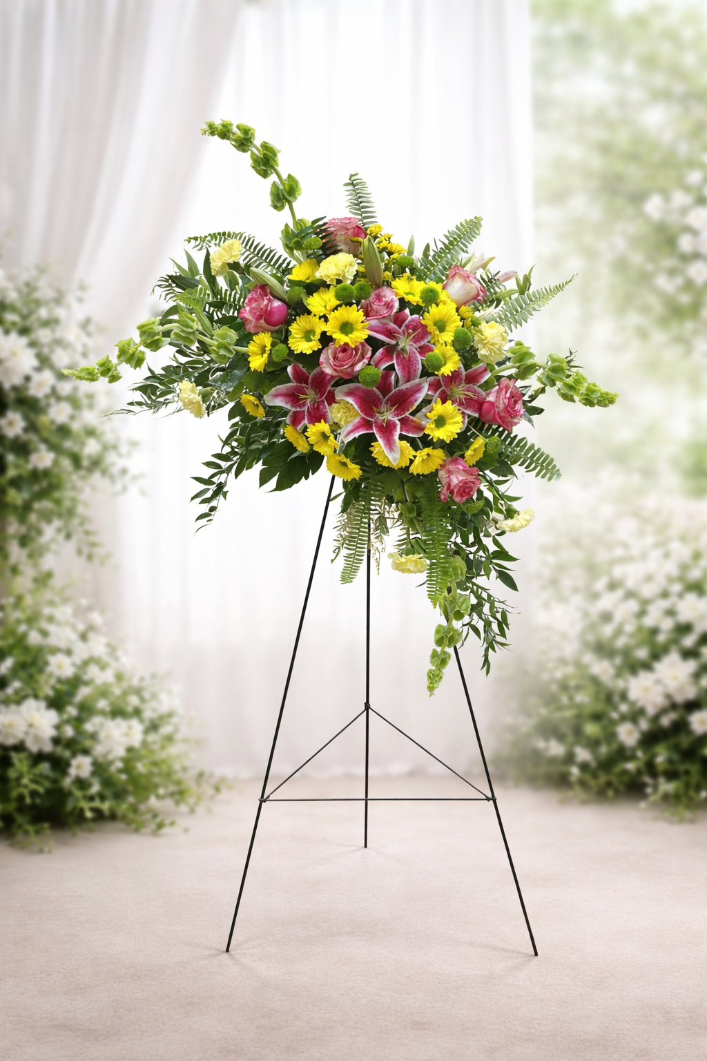 Faithful Comfort is a beautifully balanced standing spray designed to offer peace, hope, and heartfelt remembrance. Featuring graceful pink lilies, soft roses, cheerful yellow blooms, and lush greenery, this arrangement brings warmth and light to a service or memorial. Accented with flowing foliage and presented on an easel, it serves as a meaningful expression of sympathy and quiet encouragement during a time of loss.