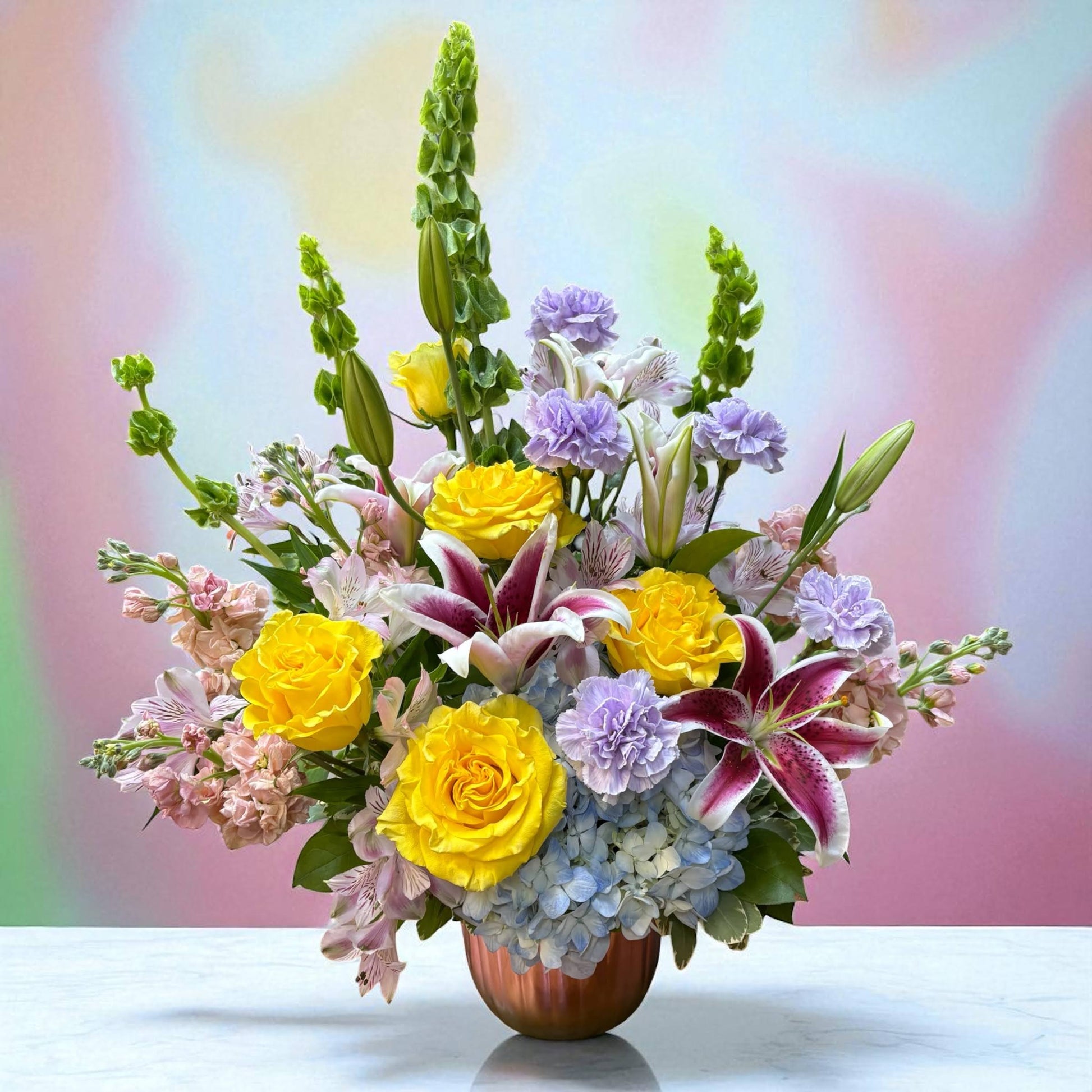 Our Graceful Reflections arrangement is a tender tribute, artfully designed in a pastel iridescent urn. Filled with bright, feminine blooms, it radiates beauty and warmth while offering comfort and remembrance. A heartfelt way to honor a life well lived and bring peace to loved ones.