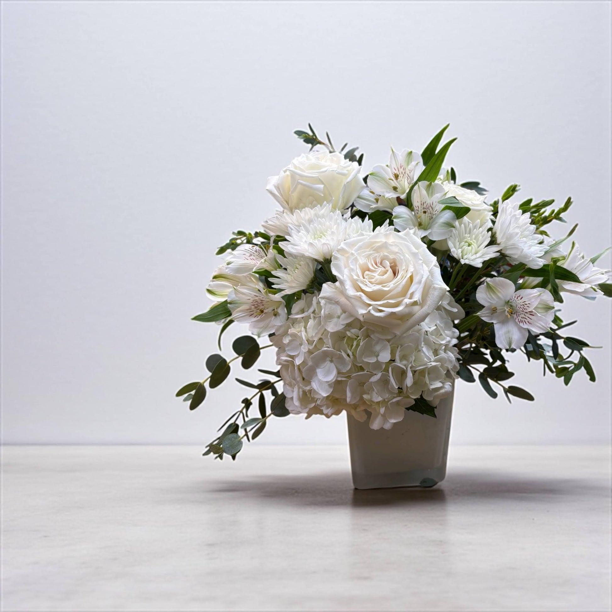 All white is as elegant as ever, and always a beautiful statement. Express your emotions with this all white cube featuring roses, hydrangea, and alstromeria