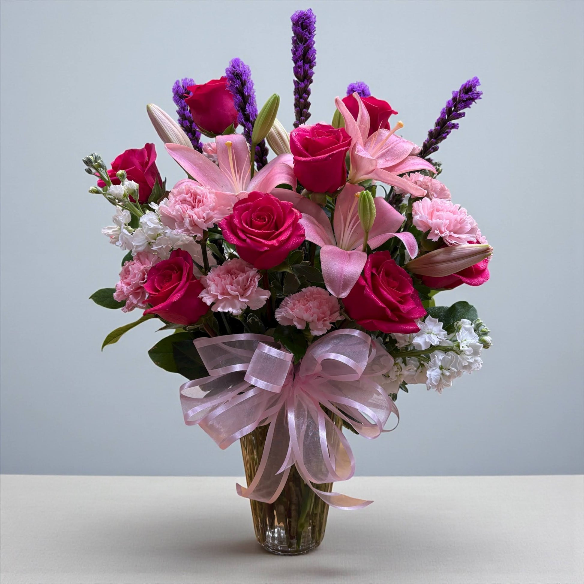 Graceful and full of beauty, Radiant Tribute is an extra-large vase arrangement designed to honor a life with elegance and love. Featuring fragrant pink lilies, vibrant hot pink roses, soft pink carnations, striking purple liatris, and delicate white stock, this stunning display symbolizes admiration, strength, and heartfelt remembrance. A truly uplifting expression of sympathy and celebration of a beautiful life.