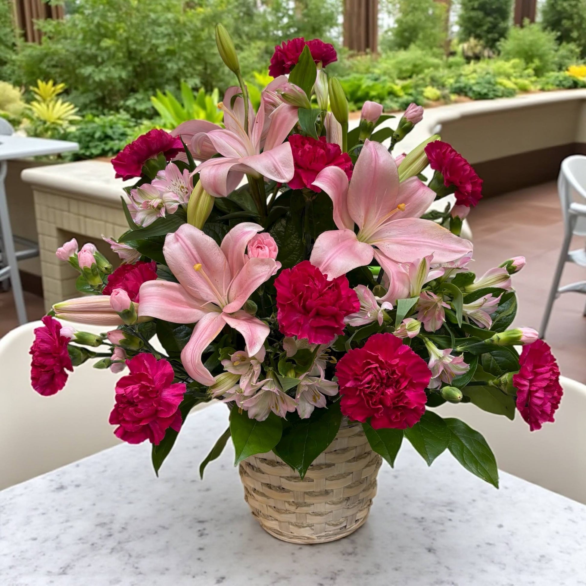 Convey your sympathy tastefully with this lovely gift of pink floral favorites in a snowy white basket. The family will be deeply touched by your thoughtfulness.